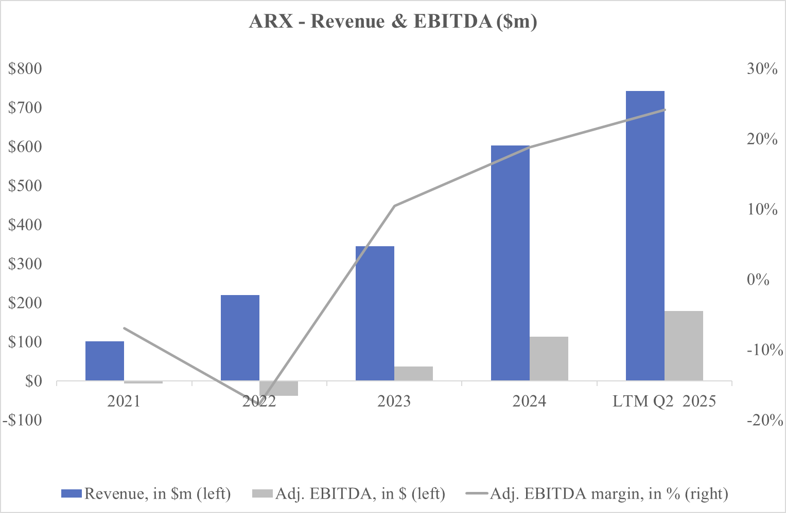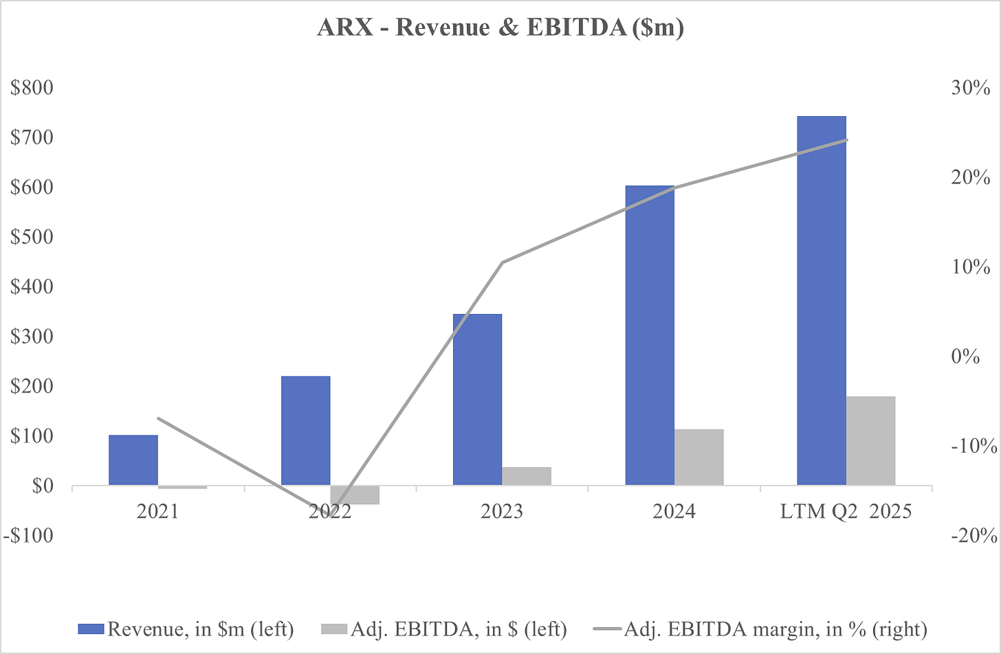 If ARX compounds revenue at ~35% through 2030 and reaches ~$3.6bn, with ~15% net margins, net income would be ~$450m ($2.20 EPS). At 13x earnings, that implies a $5.8bn market cap, or $28 per share (IRR of 6%).