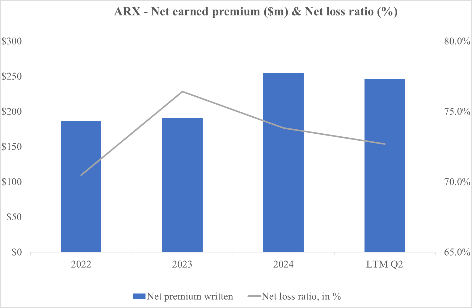 In 2024, ARX generated $225m of net earned premium, growing at about 25% per year, with a net loss ratio near 73%. That figure is broadly in line with industry averages (typically 60–75% depending on the line of business) but compares unfavourably to best-in-class specialty carriers in the SME commercial space like Kinsale, which runs closer to the mid-50s.