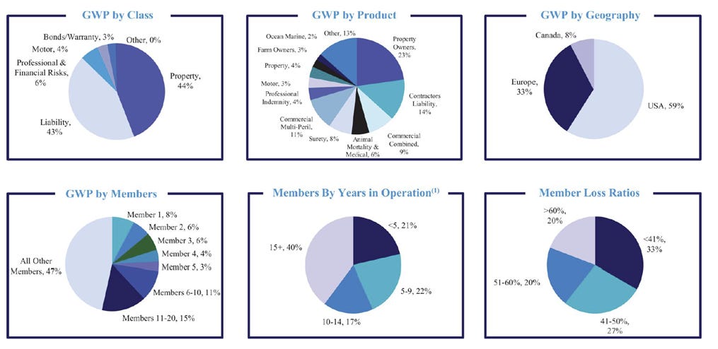 Many MGA members remain affiliated with ARX, though the mix is shifting toward more independents as the platform scales. Some are incubated as “mission members” (31 of 248), starting fresh MGAs under ARX’s umbrella. Others are “owned members” (16 of 248), where ARX holds minority stakes to align incentives and share in earnings. Together, they contributed ~$1.1bn or 30% of premiums over the last twelve months.