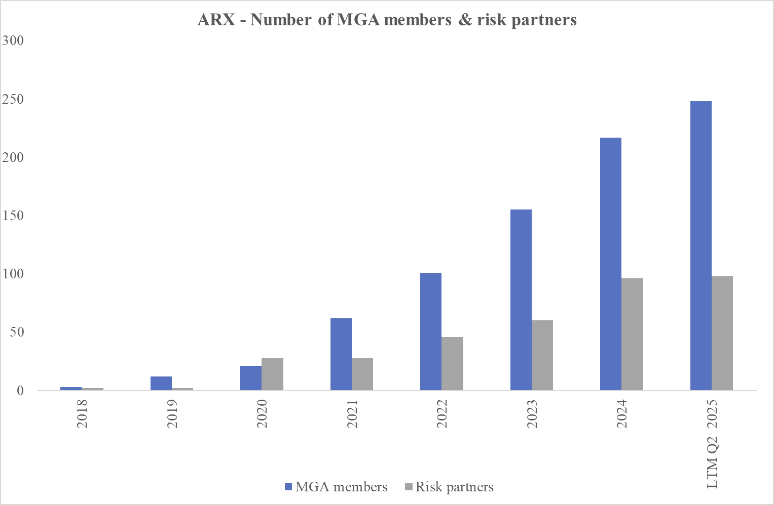 A typical MGA or a ‘member’ who joins the platform is small but sharp: $10–40m of premiums, 15–30 people, and an average of 15 years’ underwriting experience. They focus on niches, incl. property owners, contractors liability, surety, commercial multi-peril and other. ARX selects its MGAs through an apparently strict due diligence process MGA with the below set of criteria: