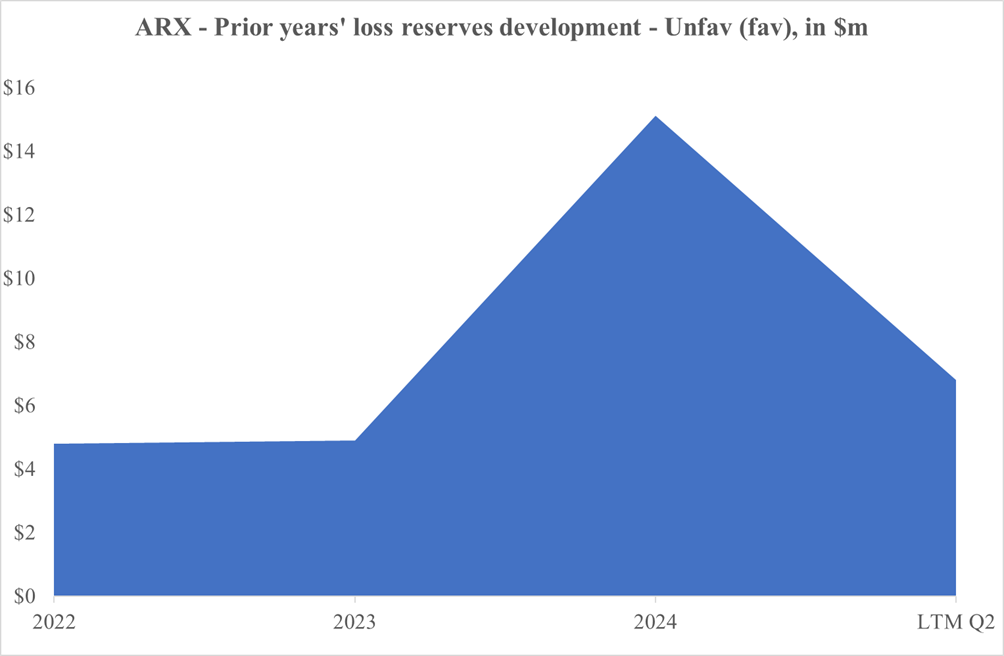 ARX does not disclose a full combined ratio on its retained specialty book, but given the loss ratio, it is likely in the 95–100% range. Reserve development has also been a modest headwind. Since inception, ARX reported unfavourable development with roughly 4%-pts of net earned premiums added each year. Management exited certain liability and property lines in the UK and Europe to stem the drag. Still, the long-tail nature of liability means some of that pain could linger. Something to watch with caution.